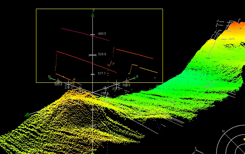 The CARIS hydrographic data cleaning system. The yellow box indicates a set of operator selected depth soundings that will be flagged as 'bad'.