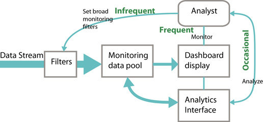 Monitoring in the analytics world is a different case, because the switch to analysis is likely to be essential. In analytics there are commonly three major types on interaction with the system as illustrated above. Typically analytics is based on a set of analyst customized filters to pull out information of interest. As analytics tasks evolve these filters must be changed to meet new requirements, althought the changes must be infrequent enough to allow a time series to be accumulated (so that noramative trends exist against which exceptions can be tested). Montitoring itself will be much more fequent, occuring at intervals from a few minutes to a few hours. Of intermediate frequency is a switch to analysys. Supporting this in a fluid way is essential in analytics because only minimal informatin about emergent trends will be typically available on the screen and this may be of low quality, necessitation drill down operations on many pieces of information for everything that is actionable. The three kinds of interaction are summarized in the process diagram shown above.